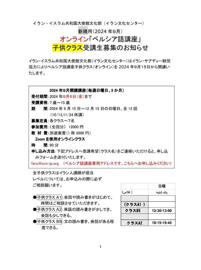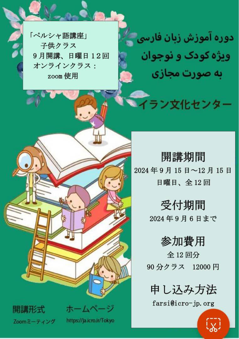 イラン.イスラム共和国大使館文化部(イラン文化センター)はイラン.サアディ財団協力によりペルシャ語講座子供クラス(オンライン)を2024年9月15日から開講いたします。