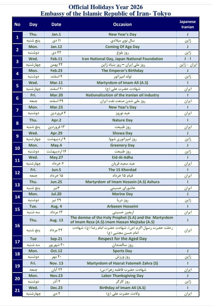 イラン・イスラム共和国大使館領事部は、2026年1月1日(木)と2日(金)は休日となります。