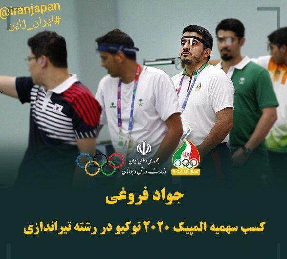 جواد فروغی ورزشکار کشورمان، سهمیه المپیک ۲۰۲۰ را برای رشته تیراندازی جمهوری اسلامی ایران به دست آورد.