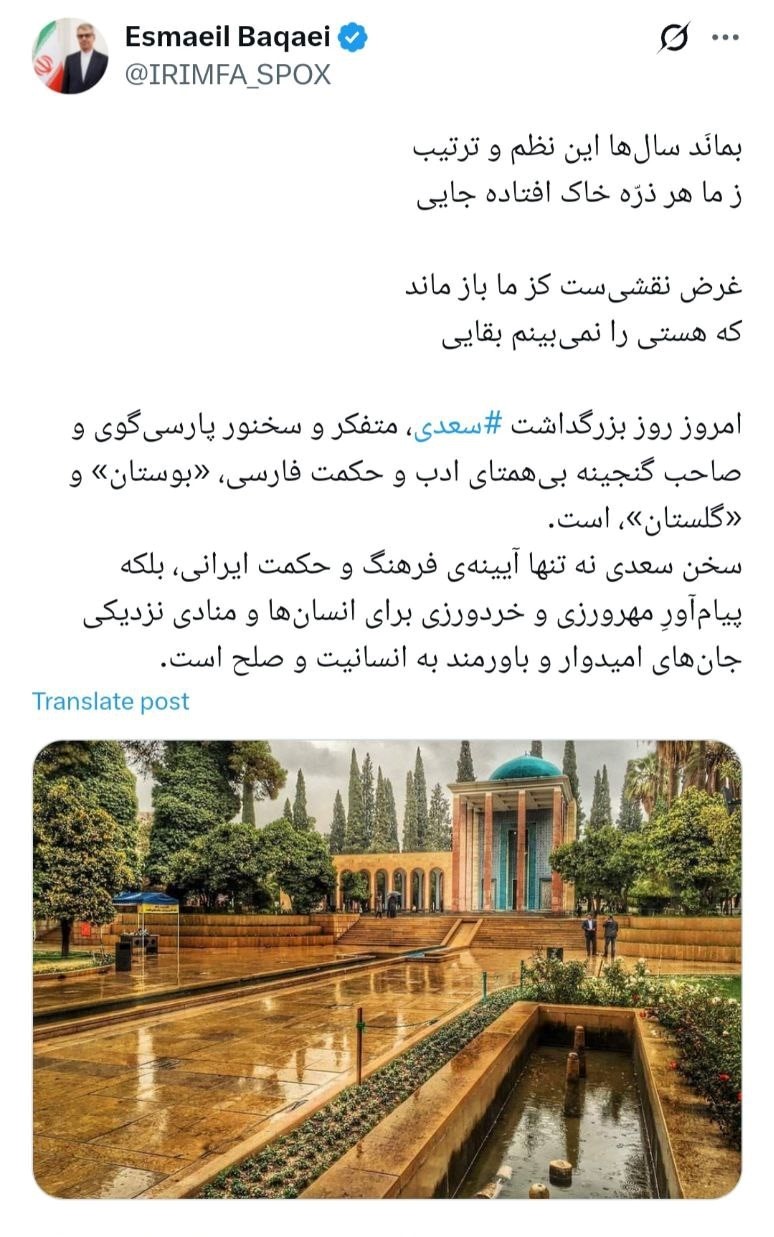 پیام سخنگوی وزارت امور خارجه در شبکه ایکس به مناسبت روز بزرگداشت سعدی