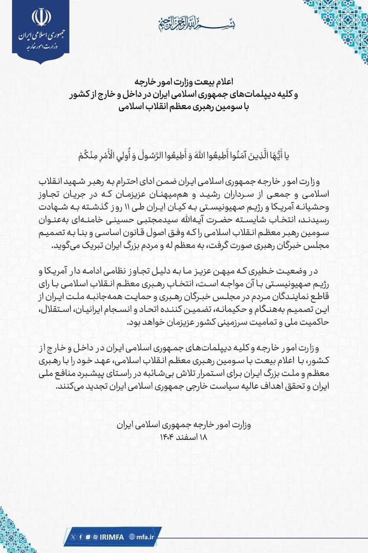 اعلام بیعت وزارت امور خارجه و کلیه دیپلماتهای جمهوری اسلامی ایران در داخل و خارج از کشور با سومین رهبر معظم انقلاب اسلامی